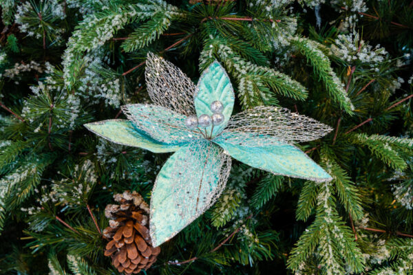 Descriere Decoratiune pentru brad in forma de floare, culoare turcoaz, dimensiune 26x 27×15 cm, HB-514