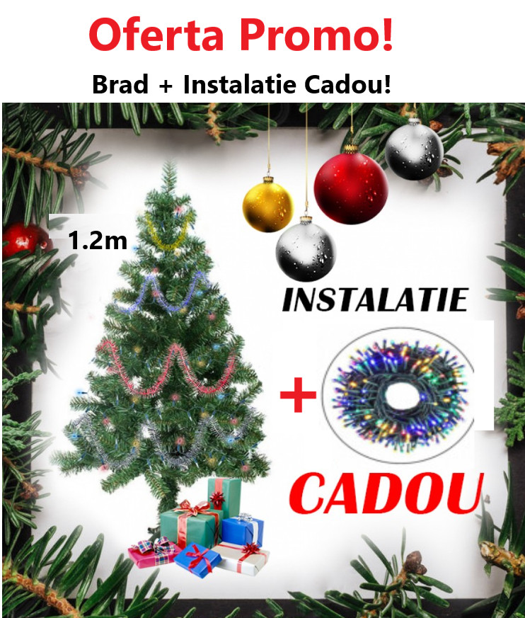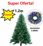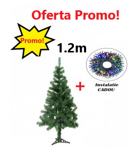Oferta Brad Artificial de Craciun 120 cm, Suport Inclus + Instalatie 100 Leduri Cadou