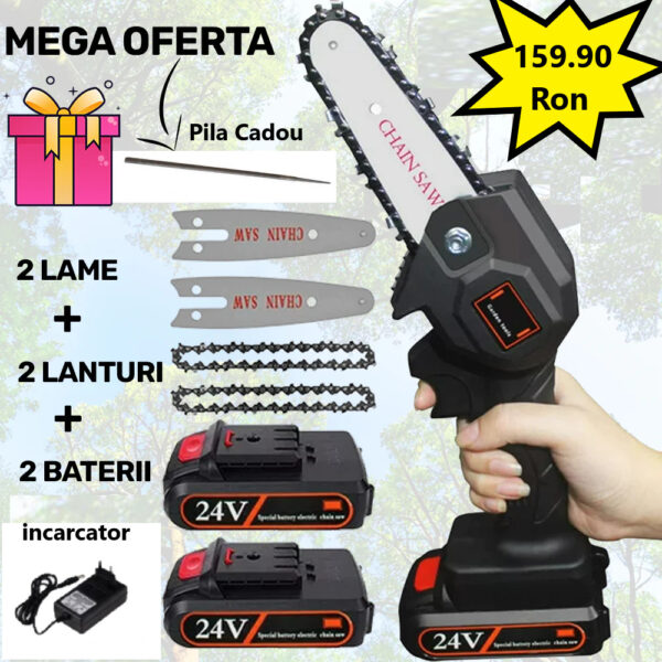 Super Oferta - Mini Drujba Fierastrau, complet echipata, cu 1Lama, 1Lant, 1Acumulator si incarcator + 1 Pila de Ascutit CADOU! Super Oferta – Mini Drujba Fierastrau, cu 2Lame, 2 Lanturi, 2 Acumulatori si incarcator + 1 Pila de Ascutit CADOU!
